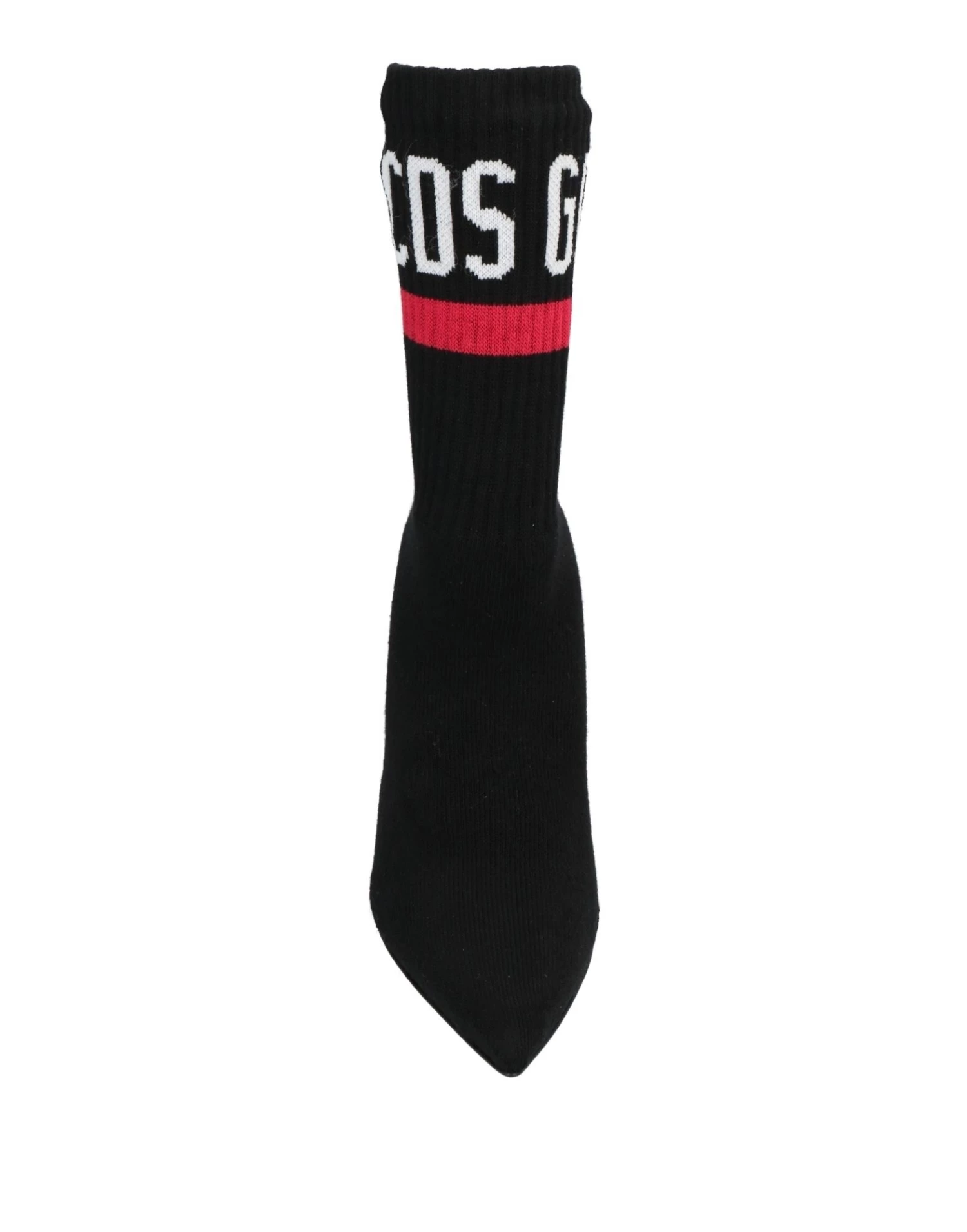 knitted, ribbed, brand logo, multicolor pattern, leather backing, narrow toeline, square heel, rubber sole, contains non-textile parts of animal origin
