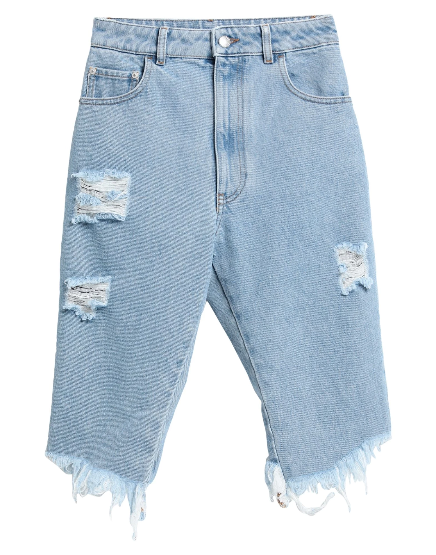 denim, faded, torn fabric, brand logo, solid color, medium wash, high waisted, button closing, zipper closure, five pockets