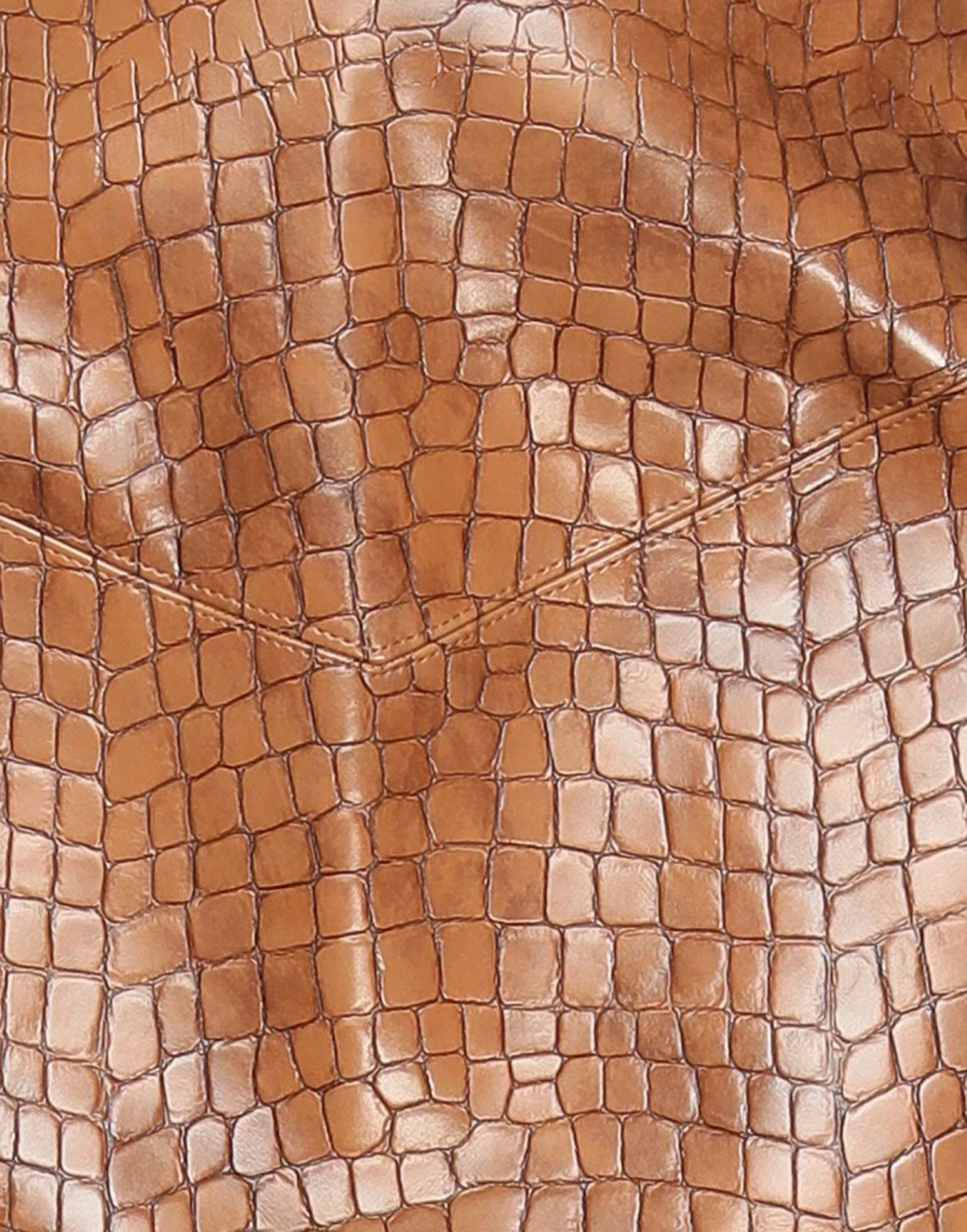 coated fabric, crocodile print, brand logo, solid color, fully lined, zipper closure, no pockets