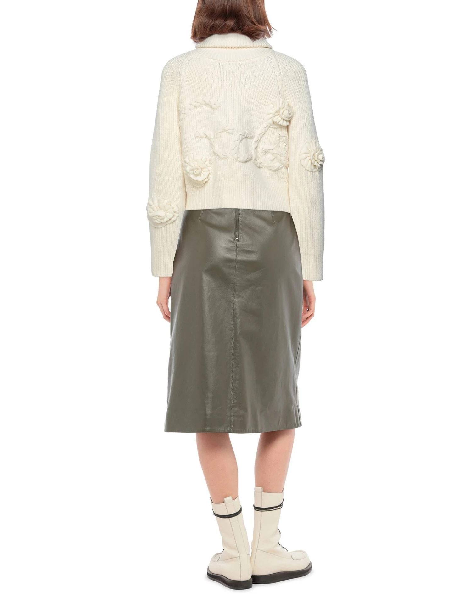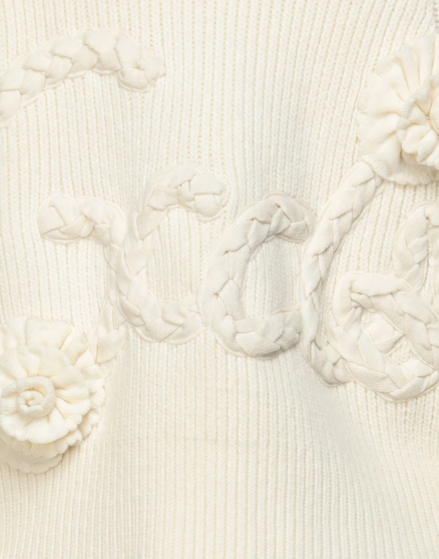 knitted, flower application, logo, medium-weight knit, turtleneck, basic solid color, long sleeves, no pockets