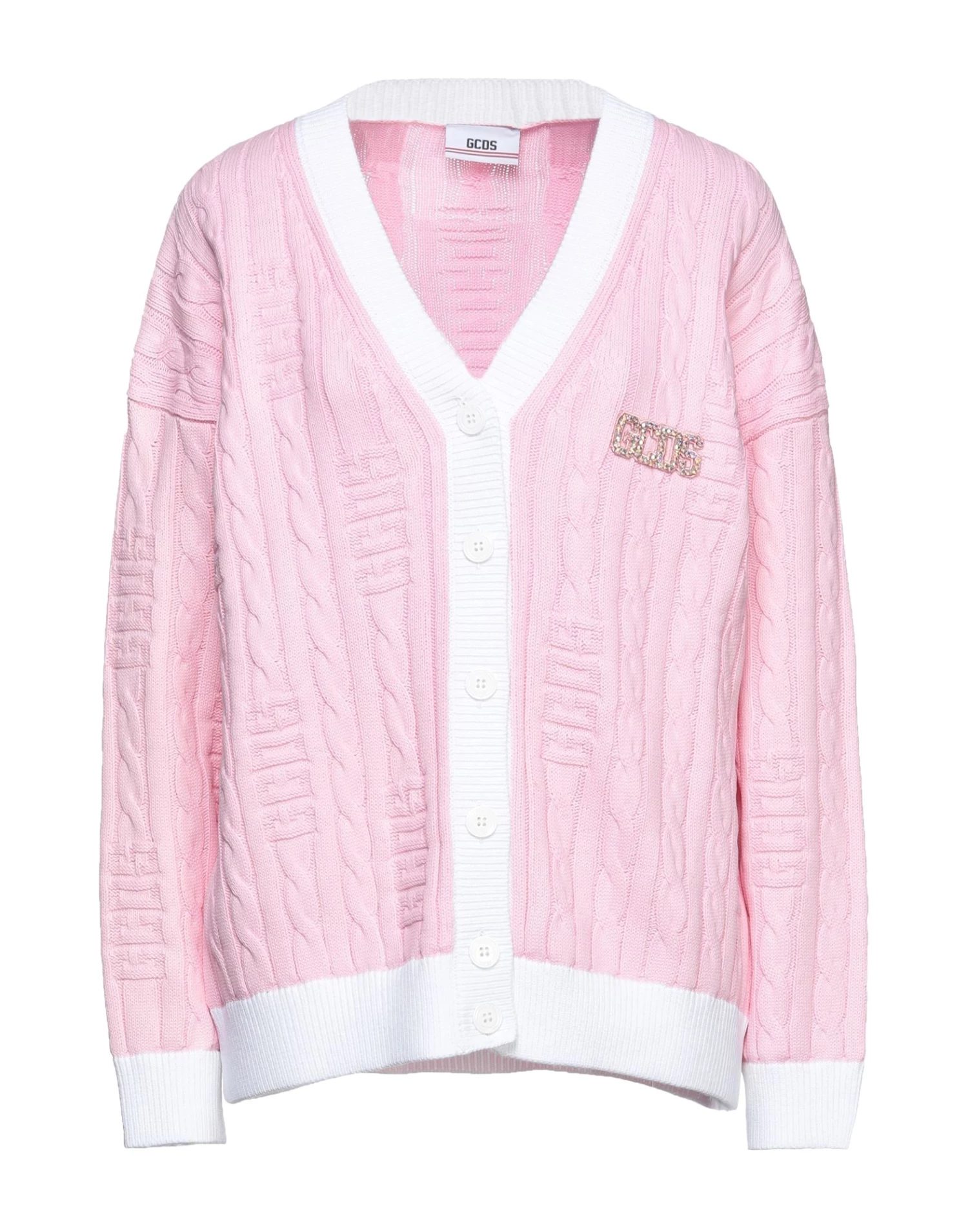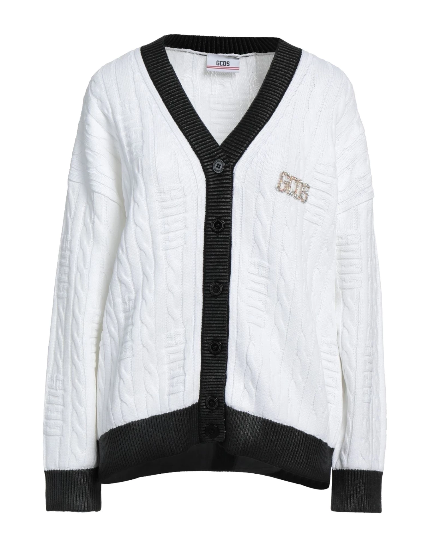 knitted, rhinestones, brand logo, v-neck, two-tone, long sleeves, front closure, button closing, no pockets, cable stitch, medium-weight knit
