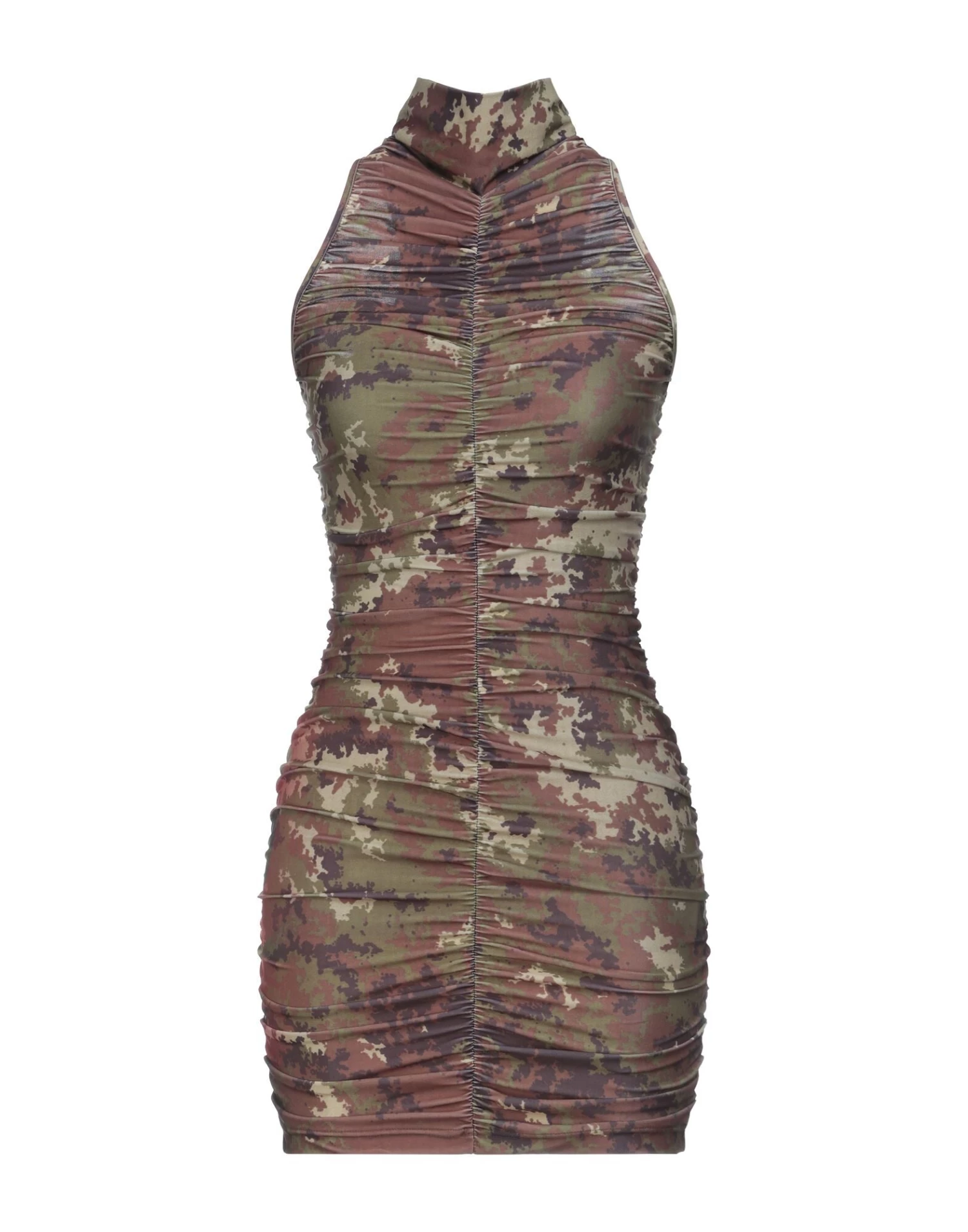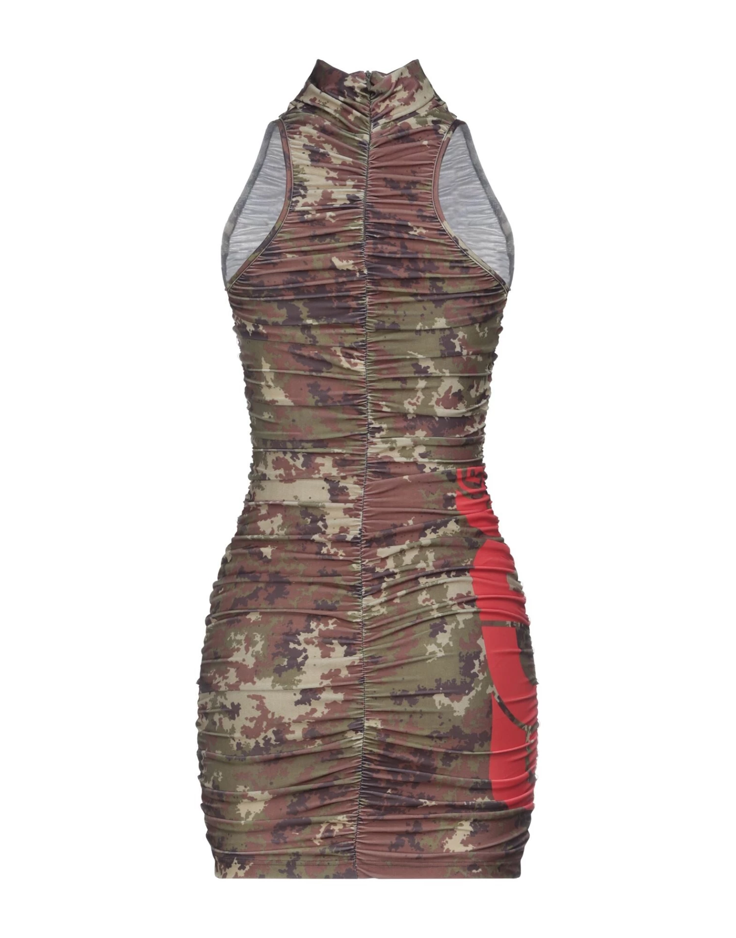synthetic jersey, logo, frills, camouflage, turtleneck, sleeveless, no pockets, rear closure, zipper closure, unlined, stretch