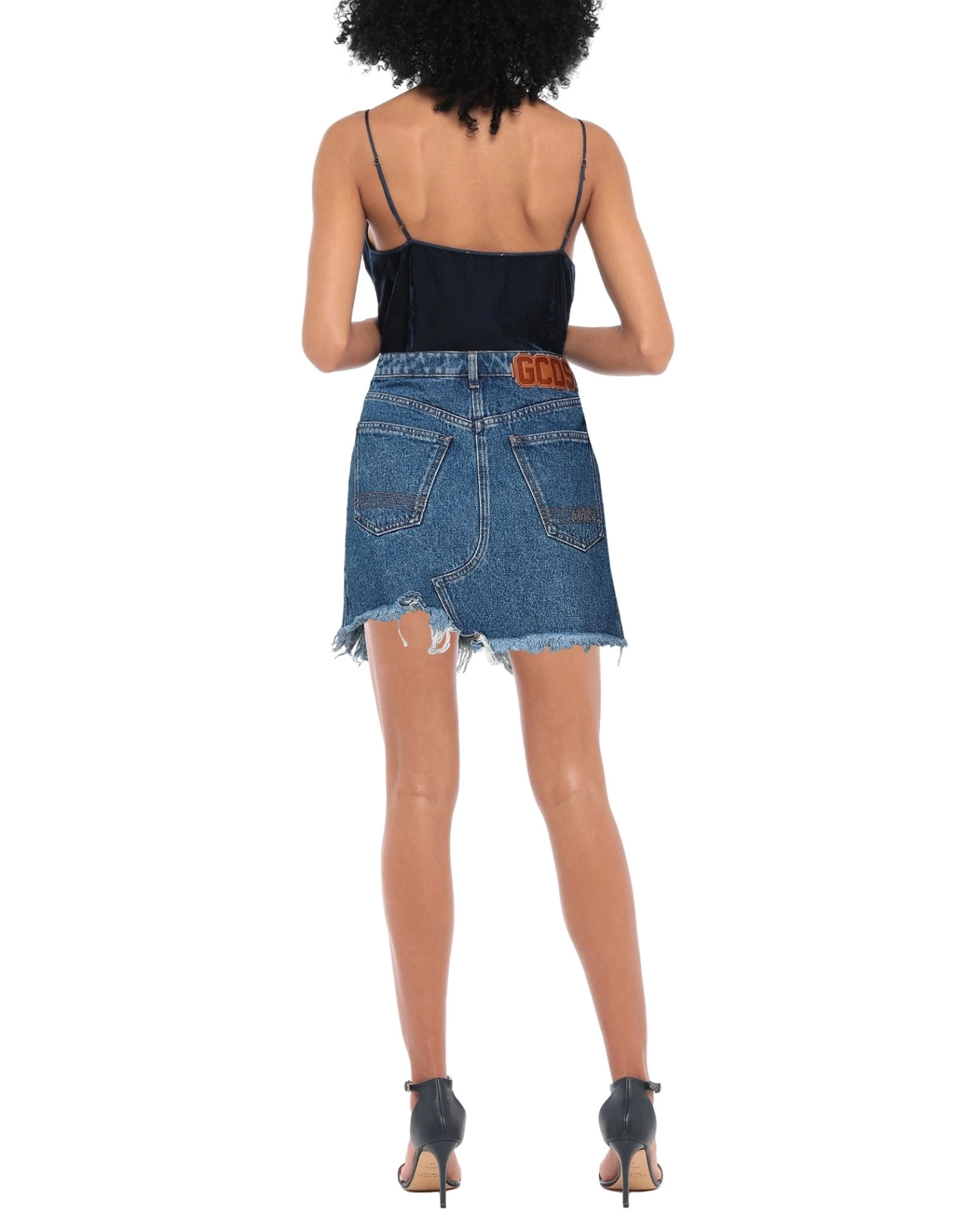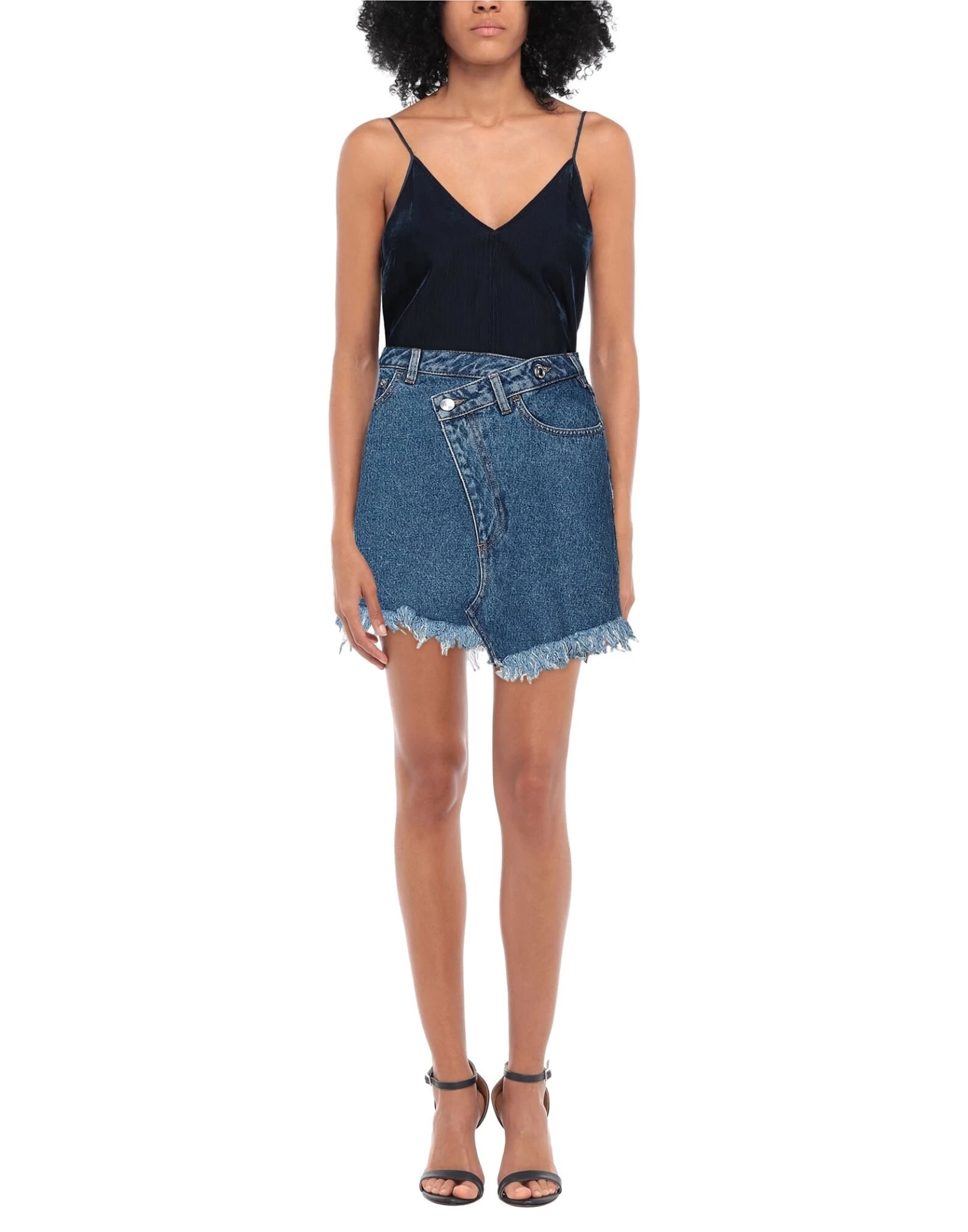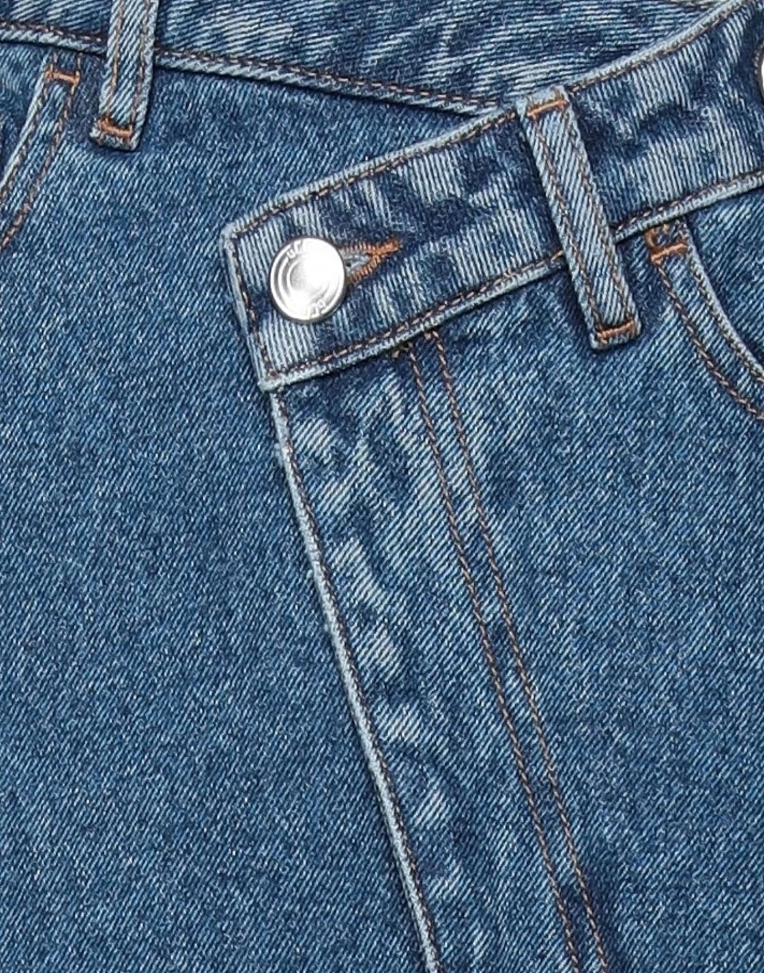 denim, brand logo, fringes, solid color, dark wash, belt loops, unlined, button closing, multipockets
