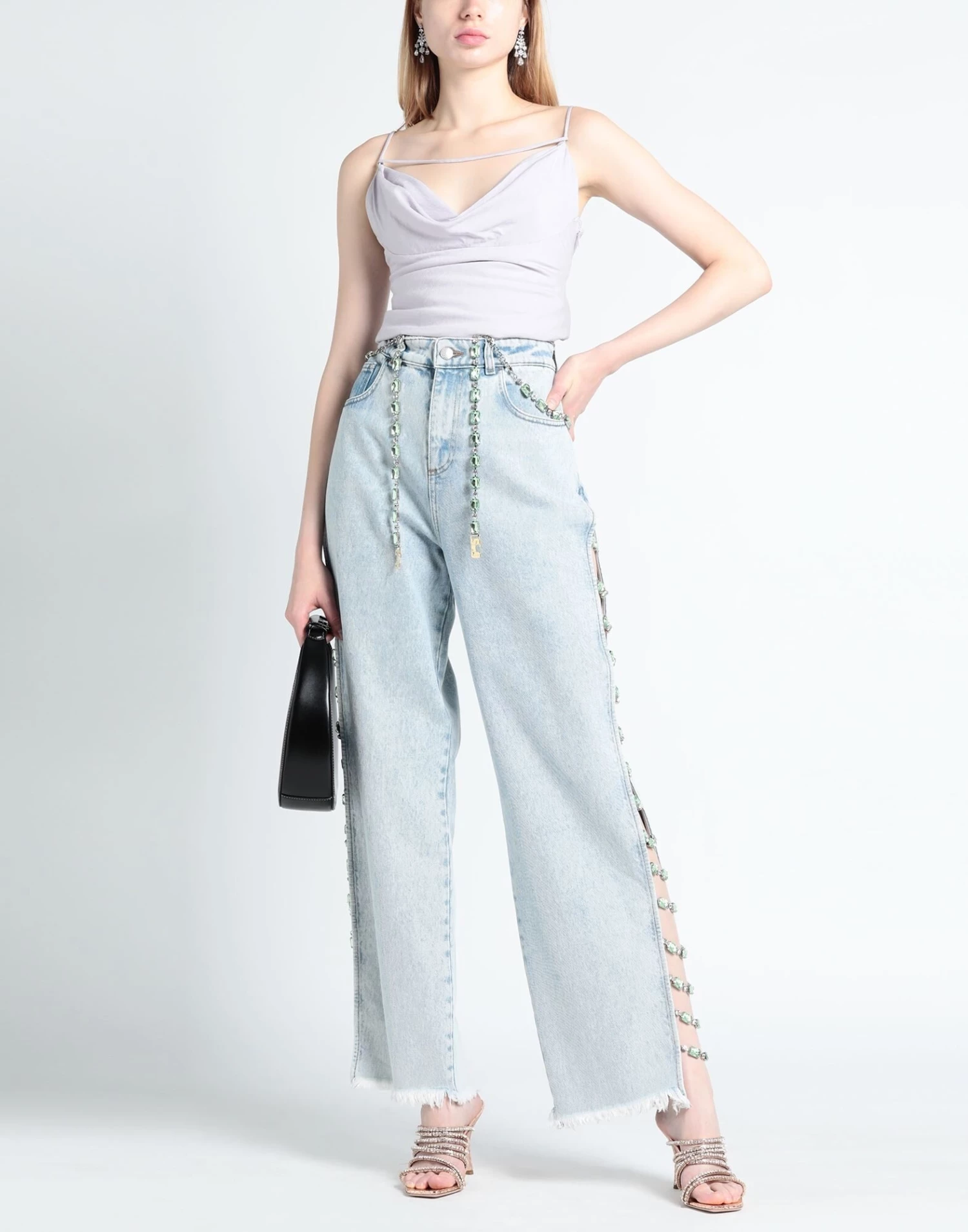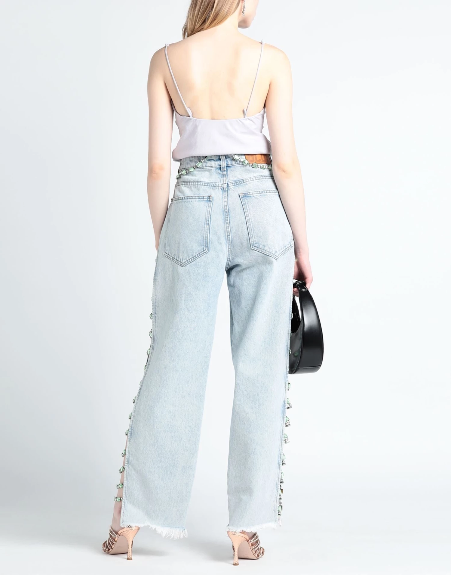 denim, faded, rhinestones, belt, multicolor pattern, medium wash, high waisted, belt loops, straight leg, regular fit, zipper closure, 1 button, five pockets