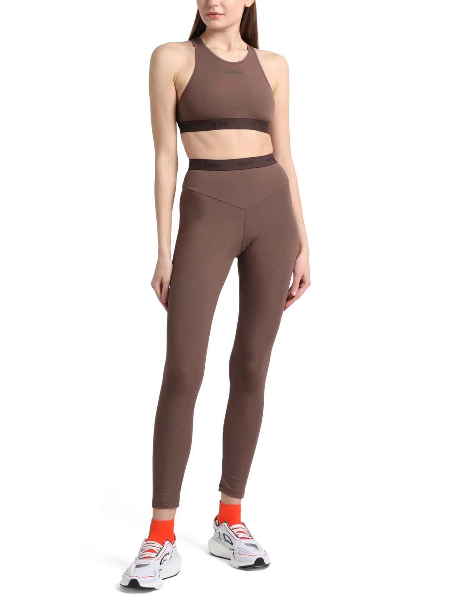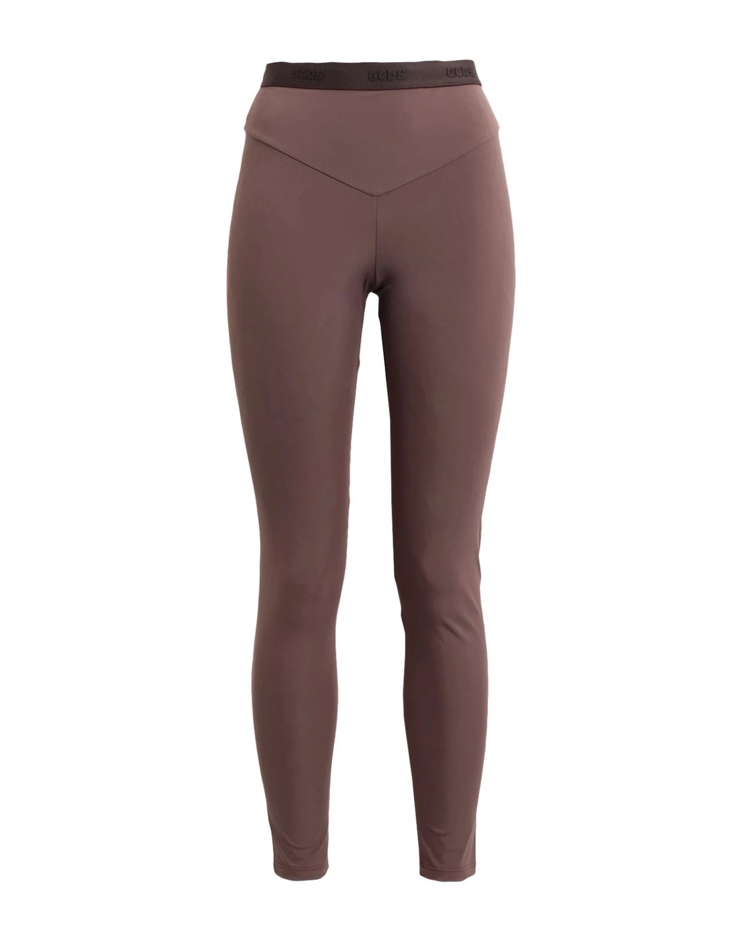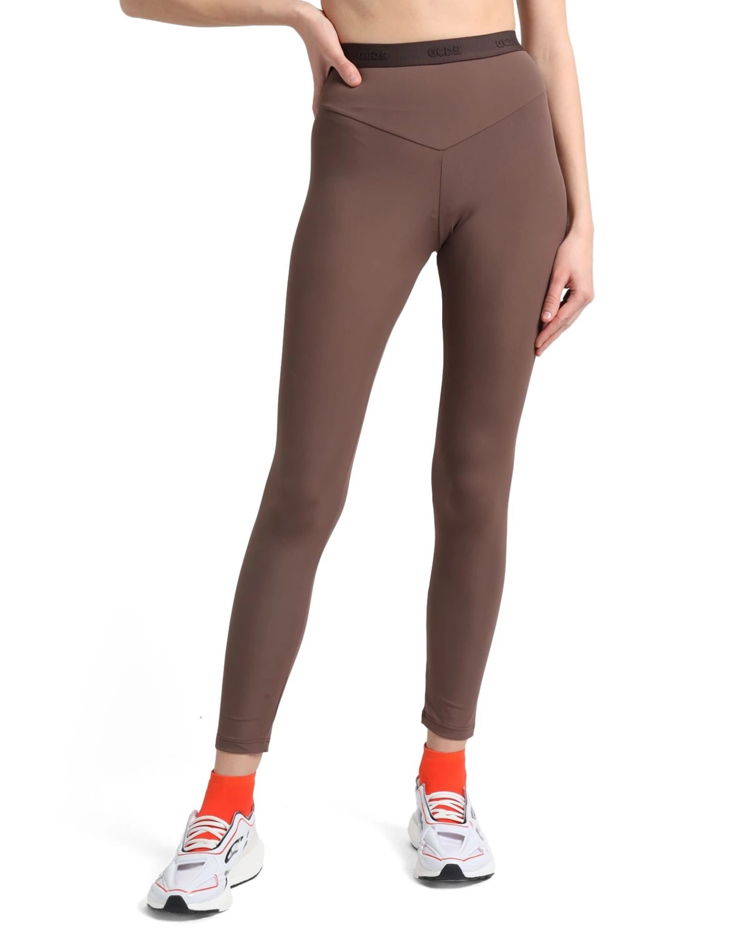 synthetic jersey, brand logo, solid color, high waisted, elasticized waist, tapered leg, slim-leg pants, no pockets, stretch