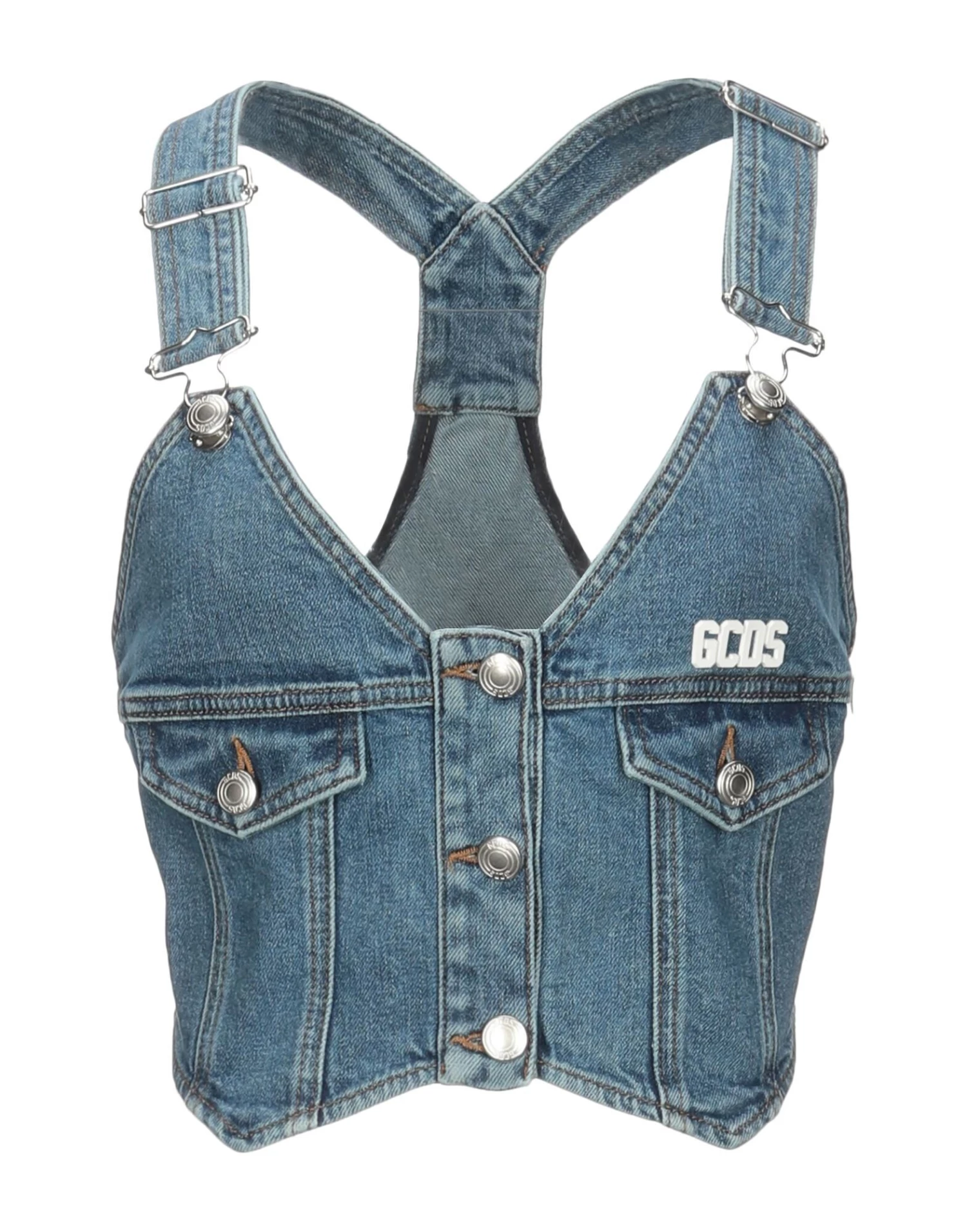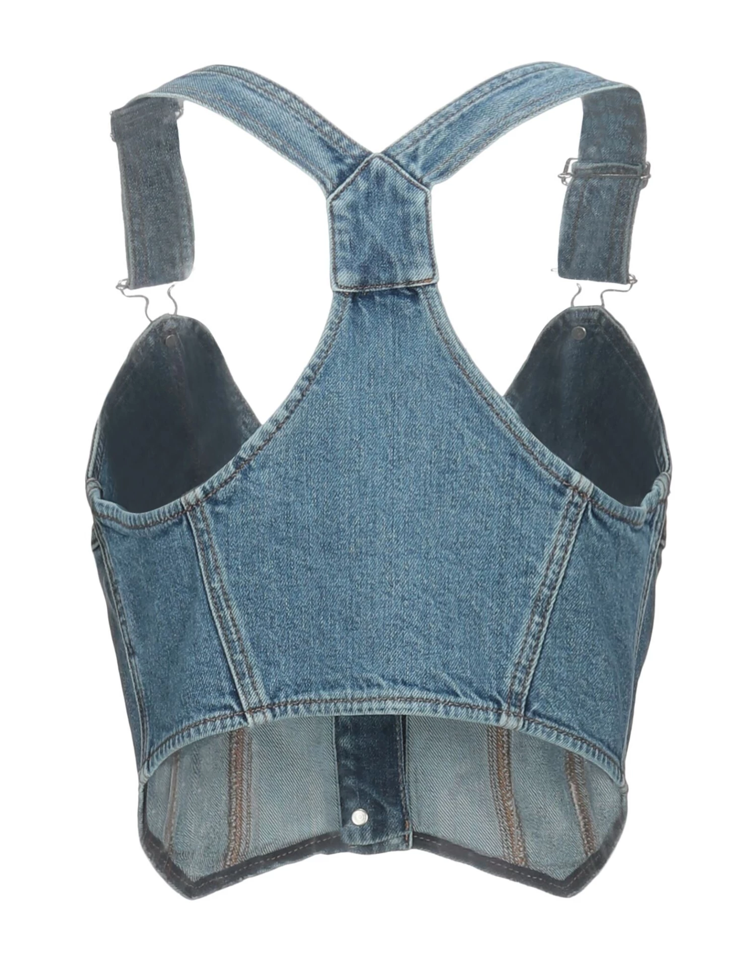 denim, logo, solid color, deep neckline, sleeveless, front closure, button closing, no pockets, stretch
