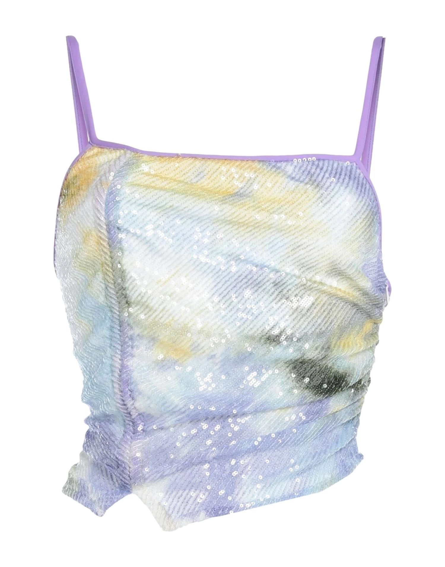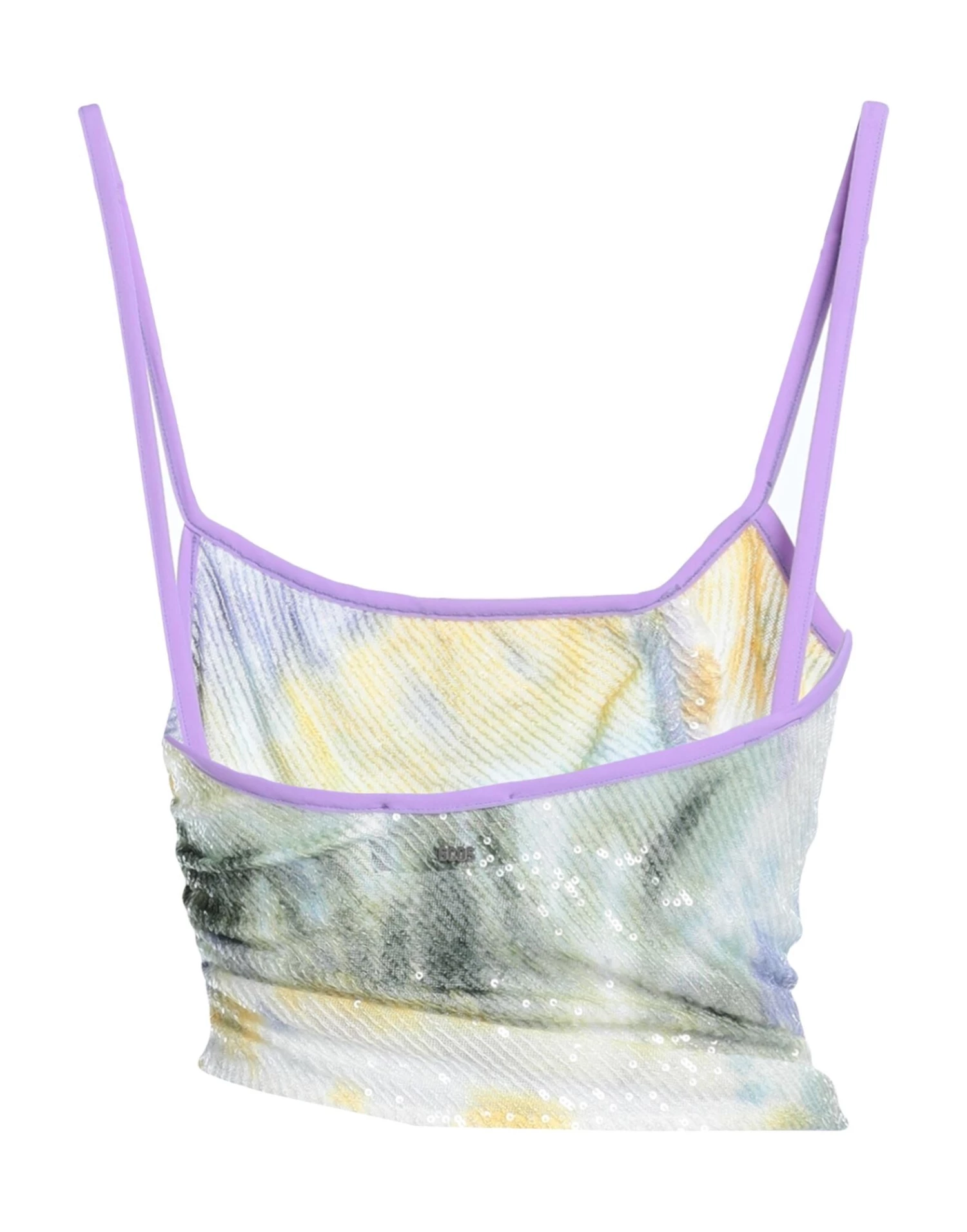 synthetic jersey, tulle, frills, sequins, multicolor pattern, wide neckline, zipper closure, sleeveless