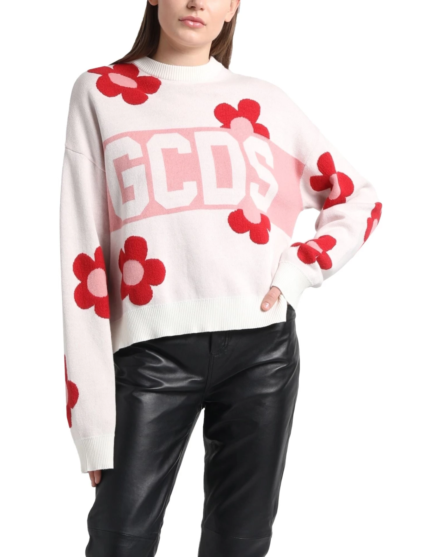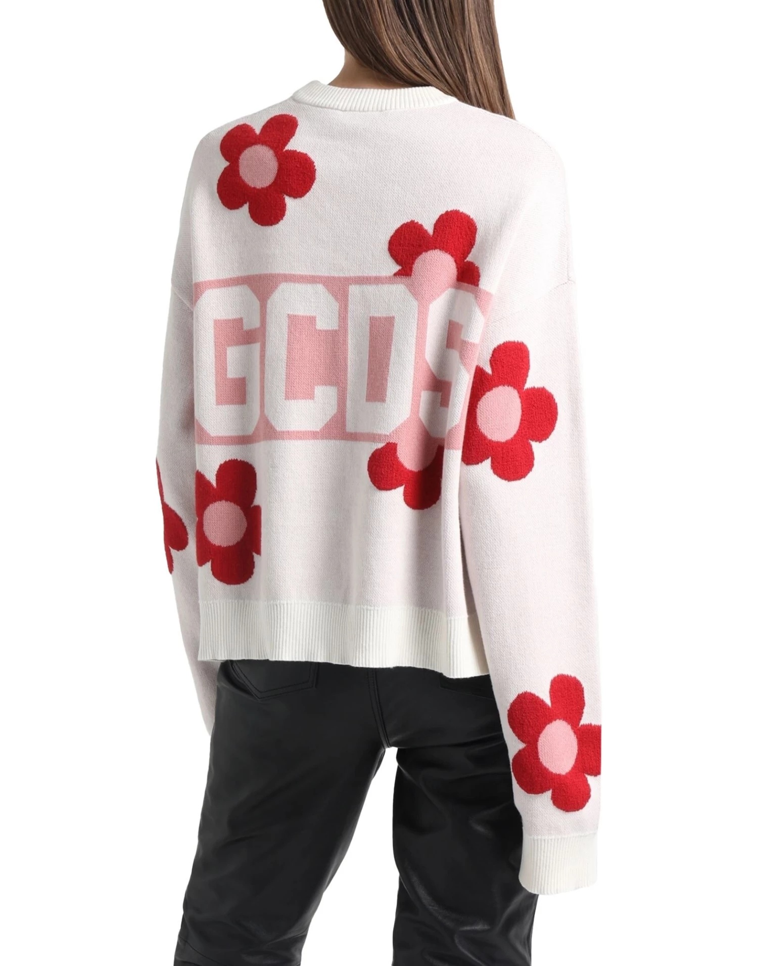 knitted, lightweight knit, brand logo, floral design, round collar, long sleeves, no pockets, side slit hemline