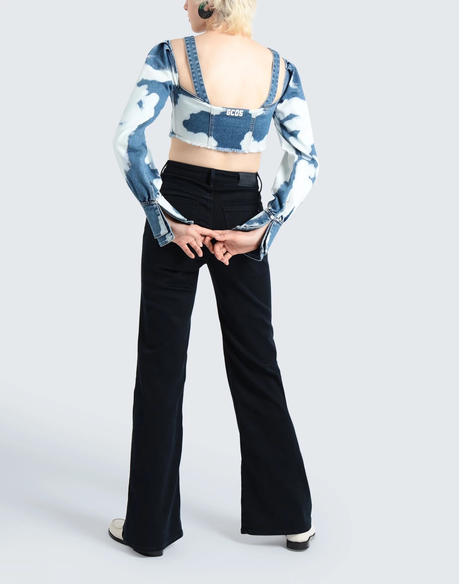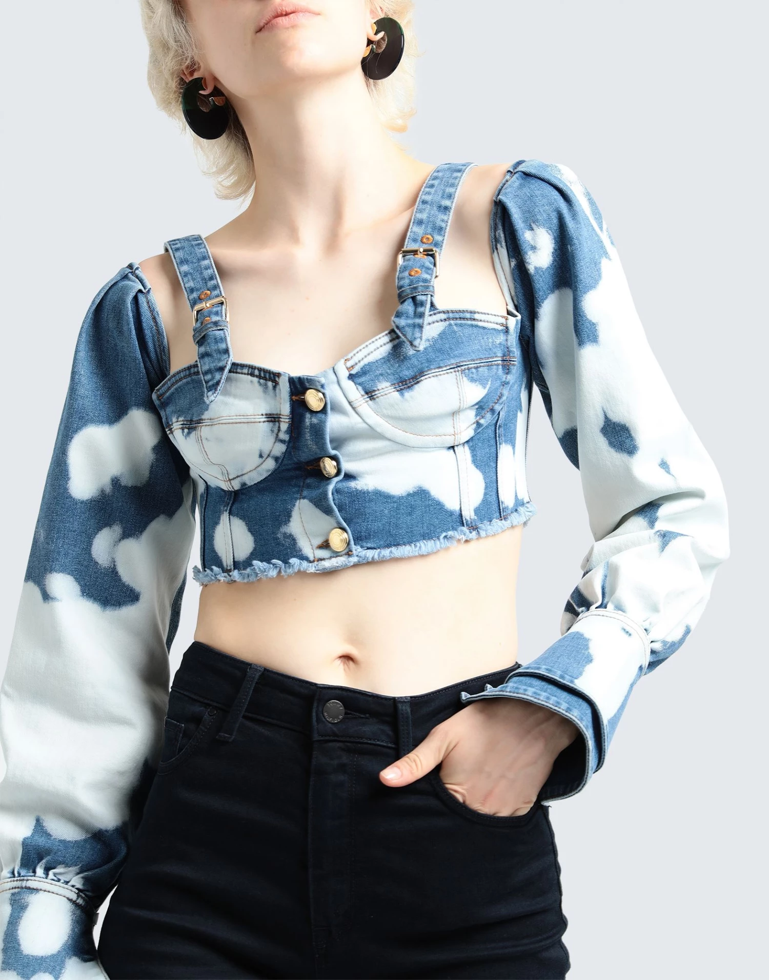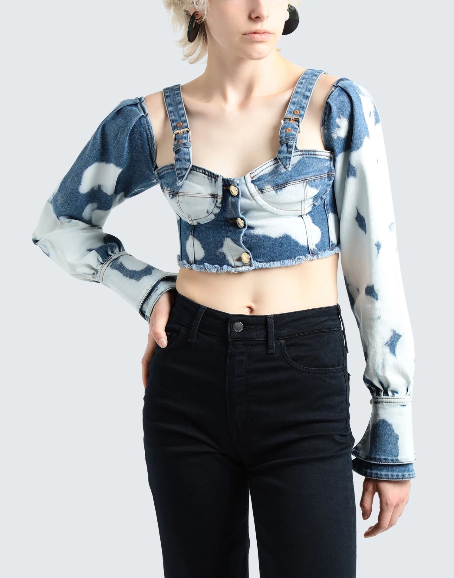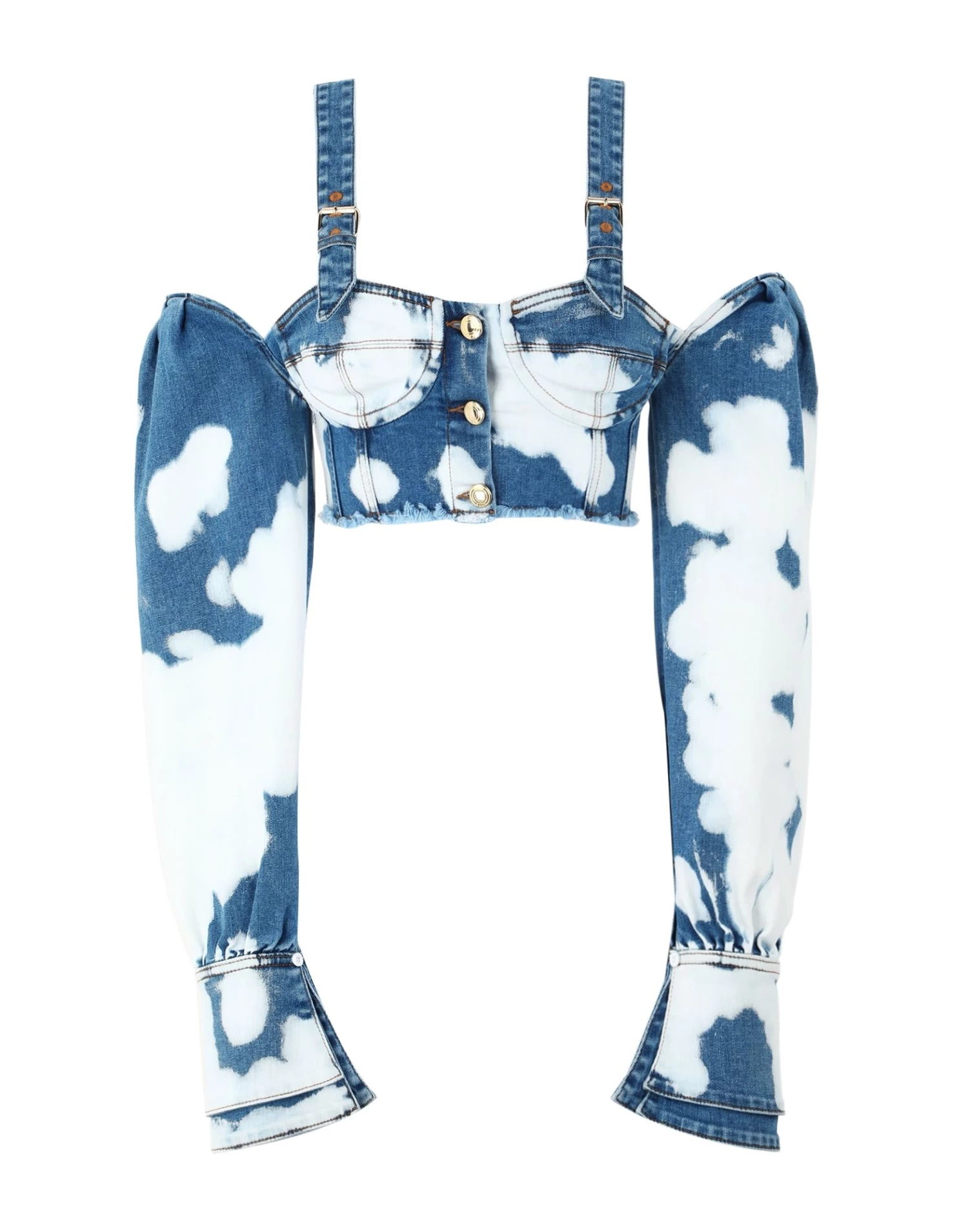 denim, faded, logo, solid color, square neckline, long sleeves, buttoned cuffs, front closure, button closing, no pockets, internal underwire, stretch