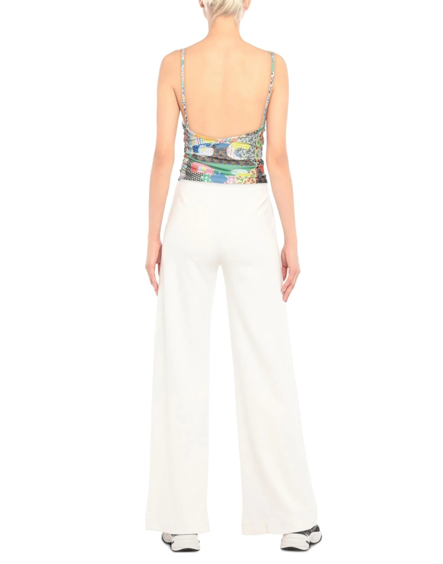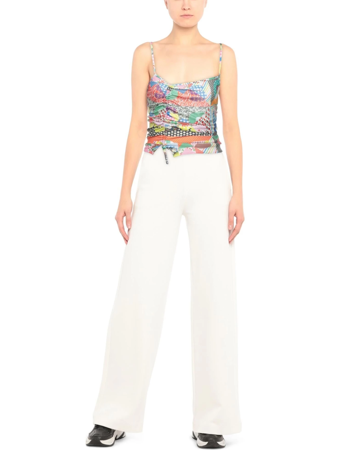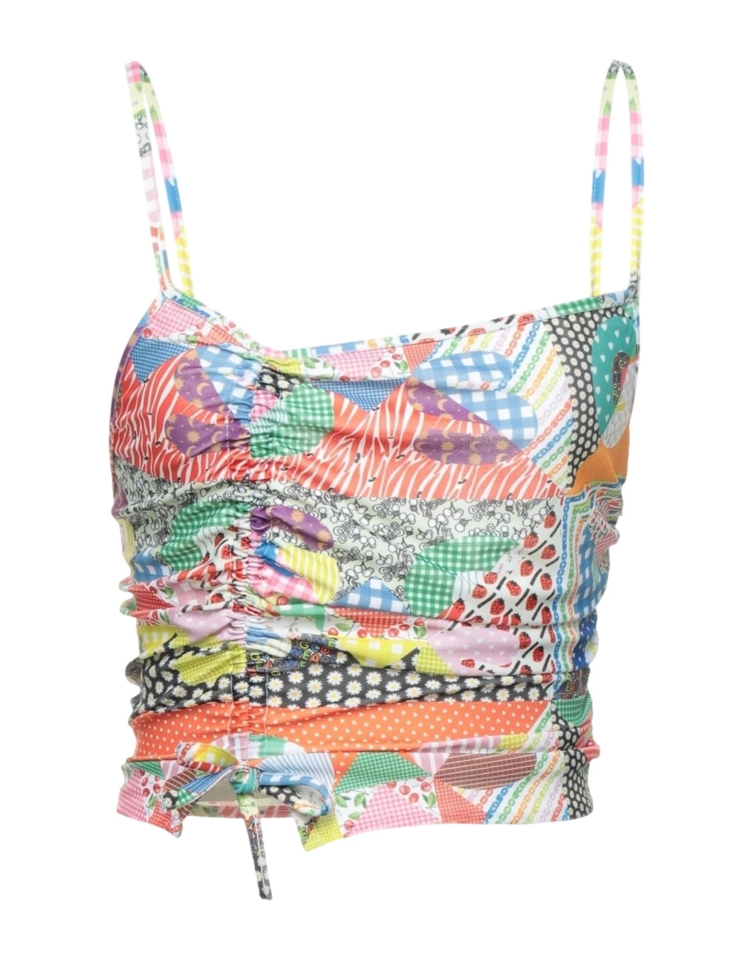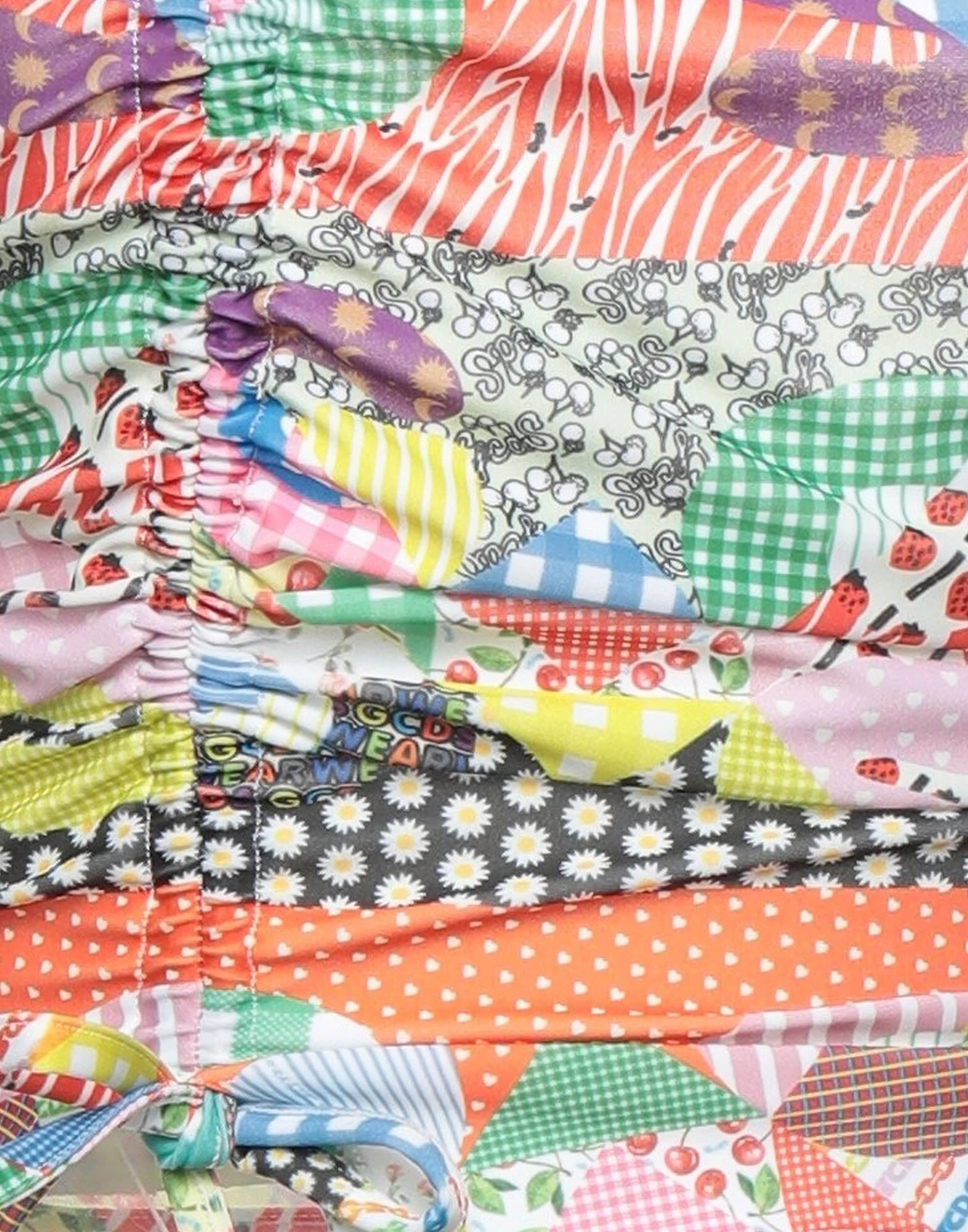 synthetic jersey, frills, brand logo, patchwork, deep neckline, sleeveless, zipper closure, no pockets, stretch