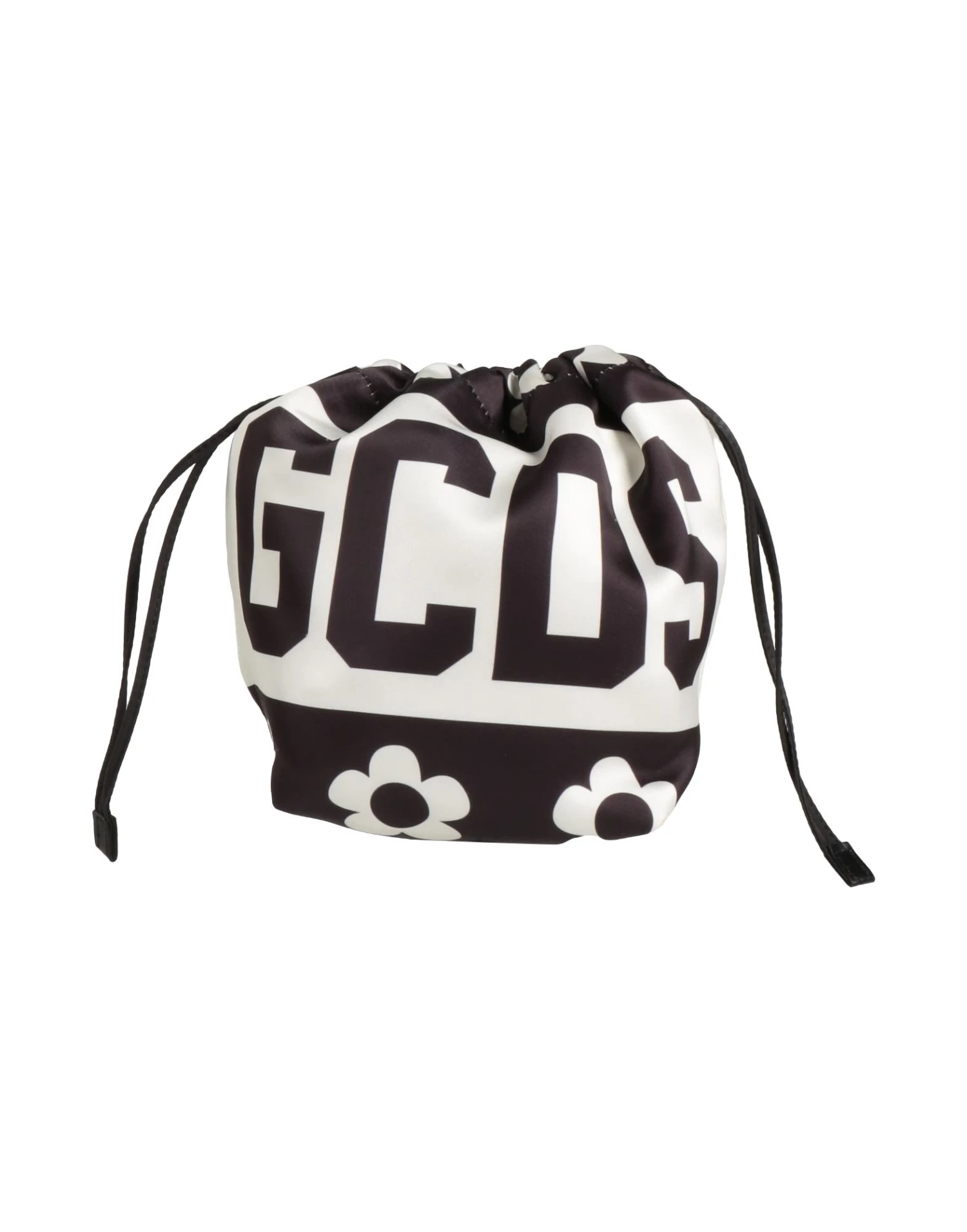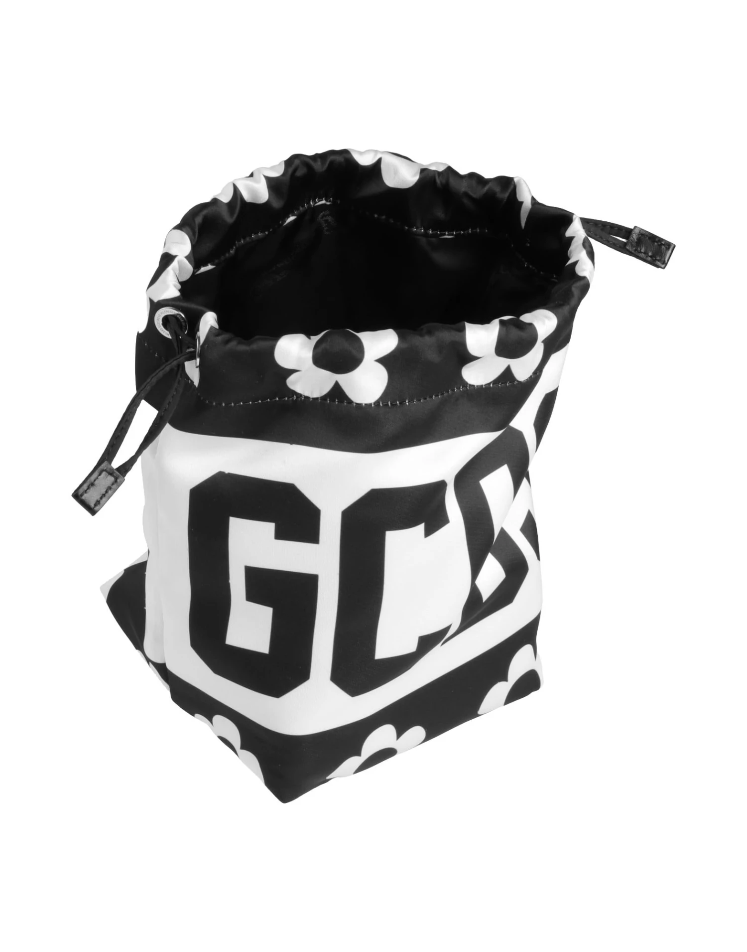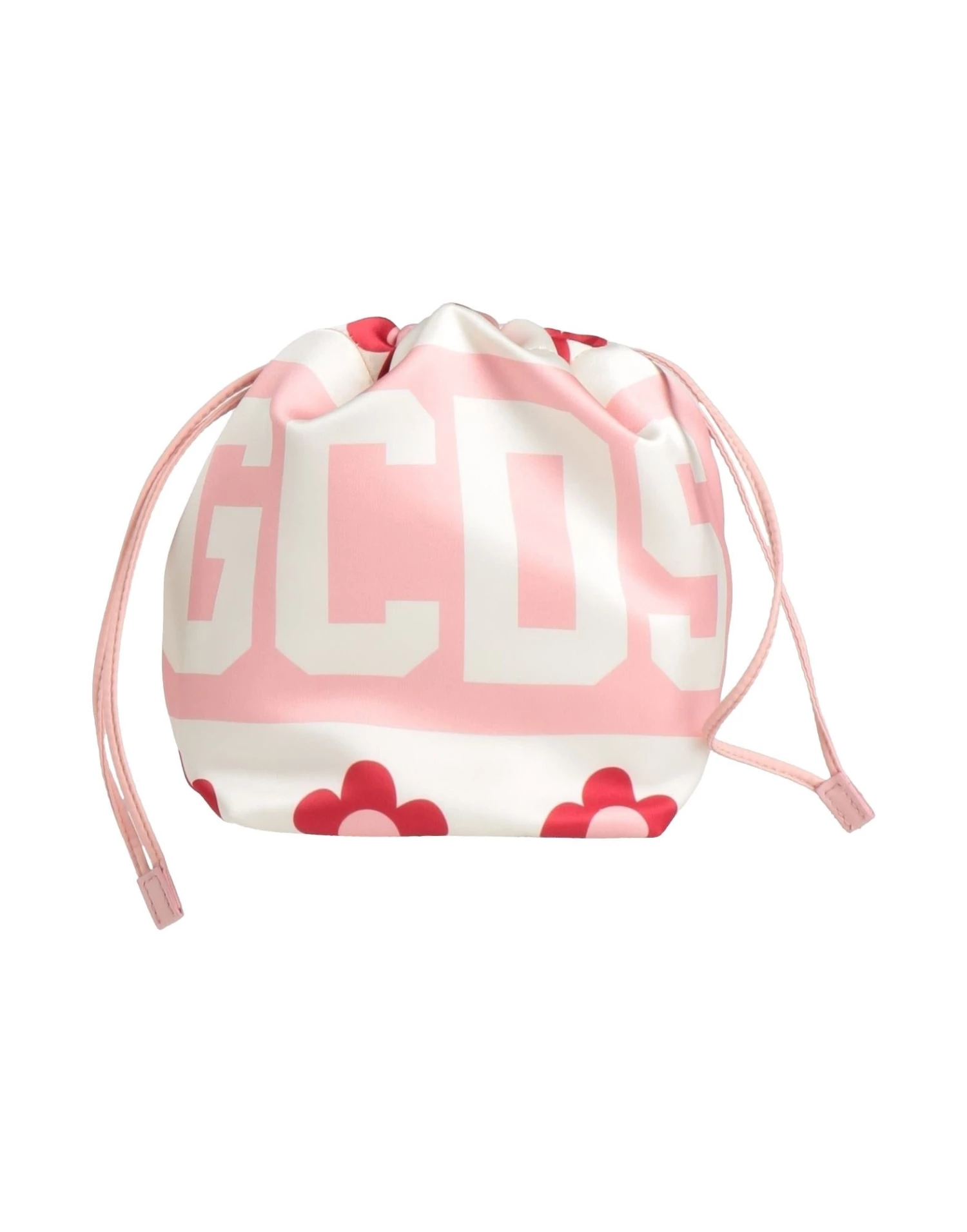 satin, brand logo, logo design, floral design, fully lined, drawstring closure, daytime, small, bucket bag