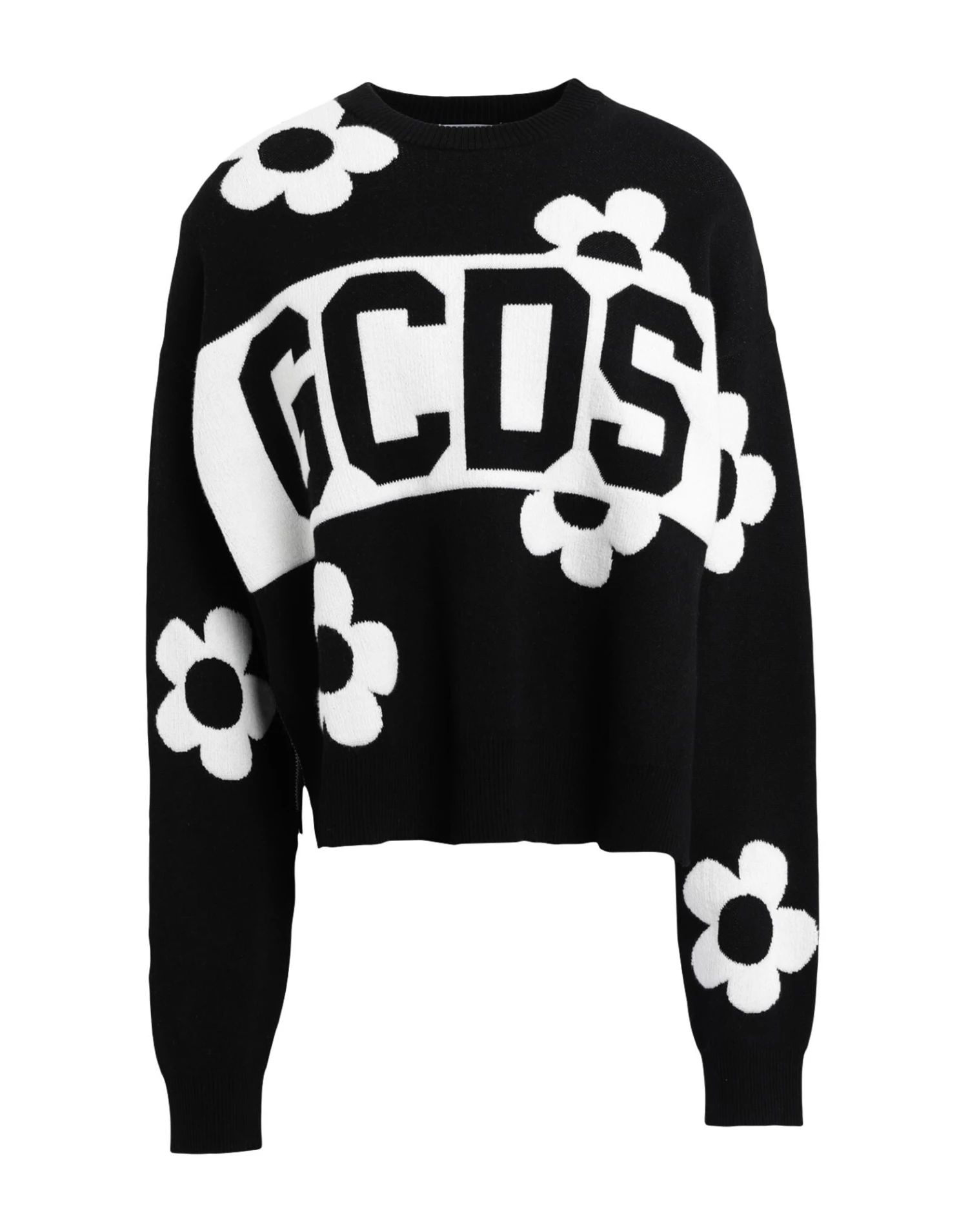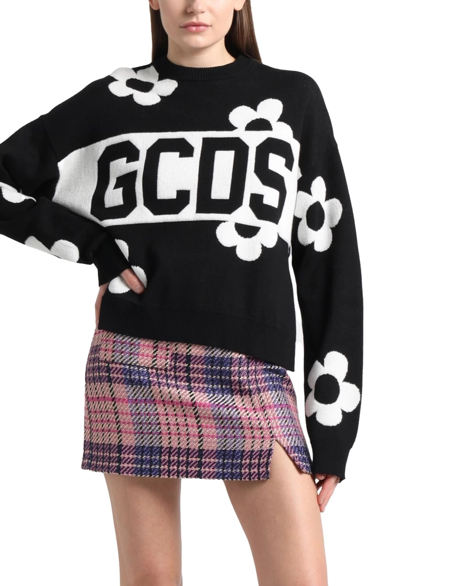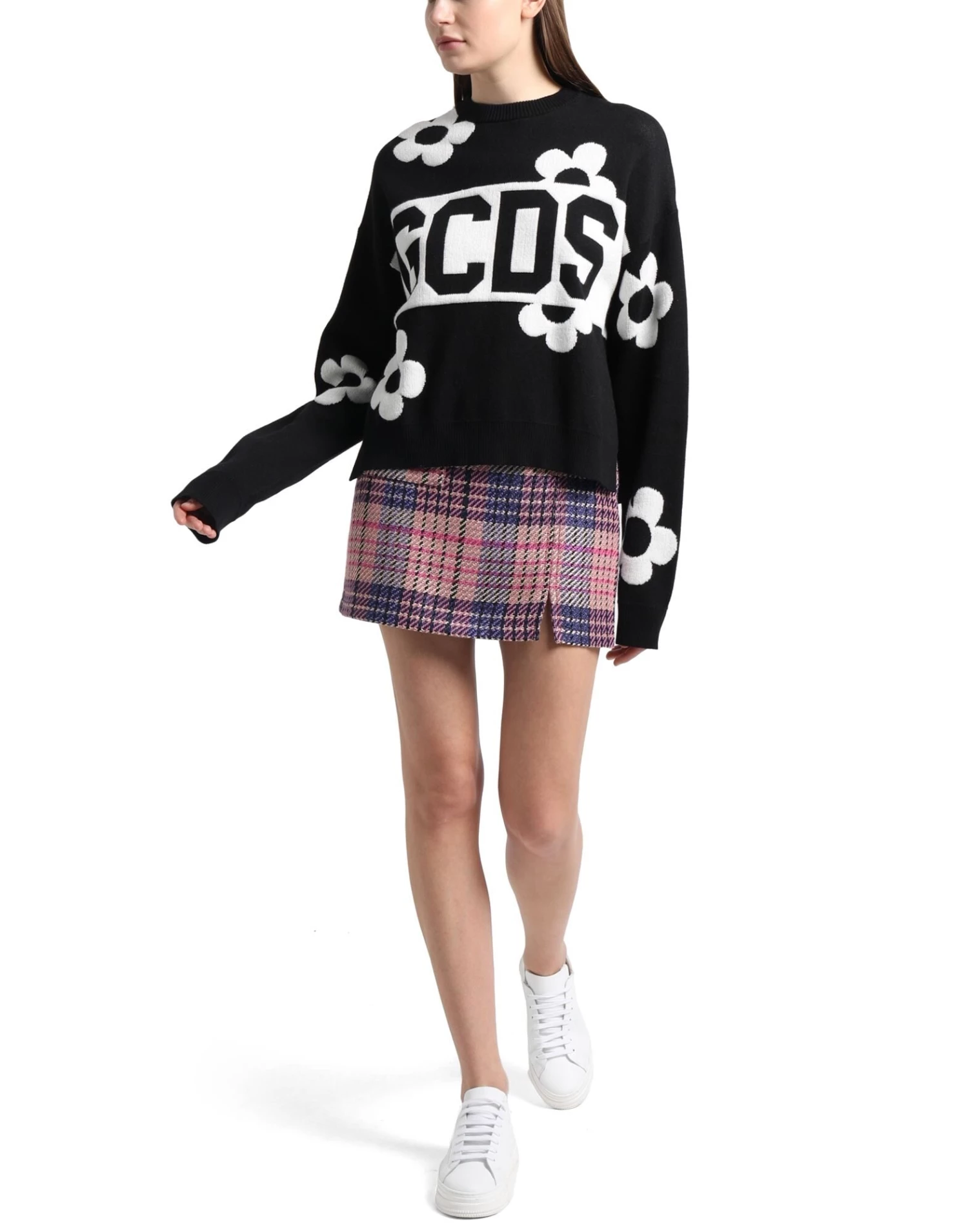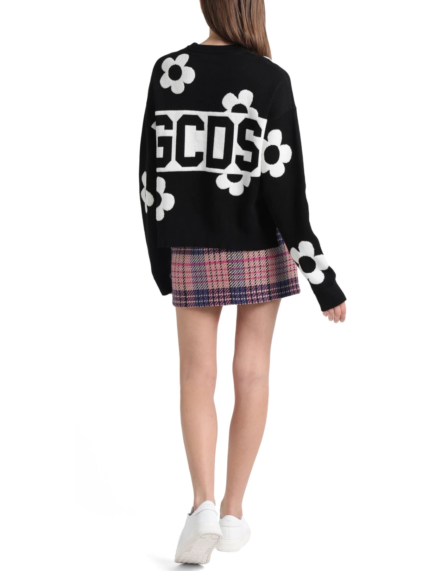 knitted, lightweight knit, brand logo, floral design, round collar, long sleeves, no pockets, side slit hemline