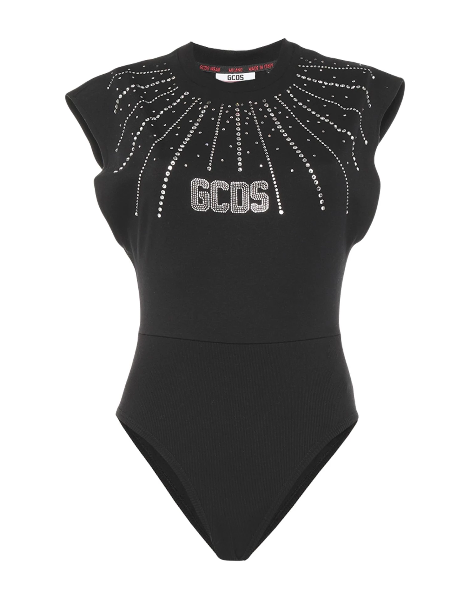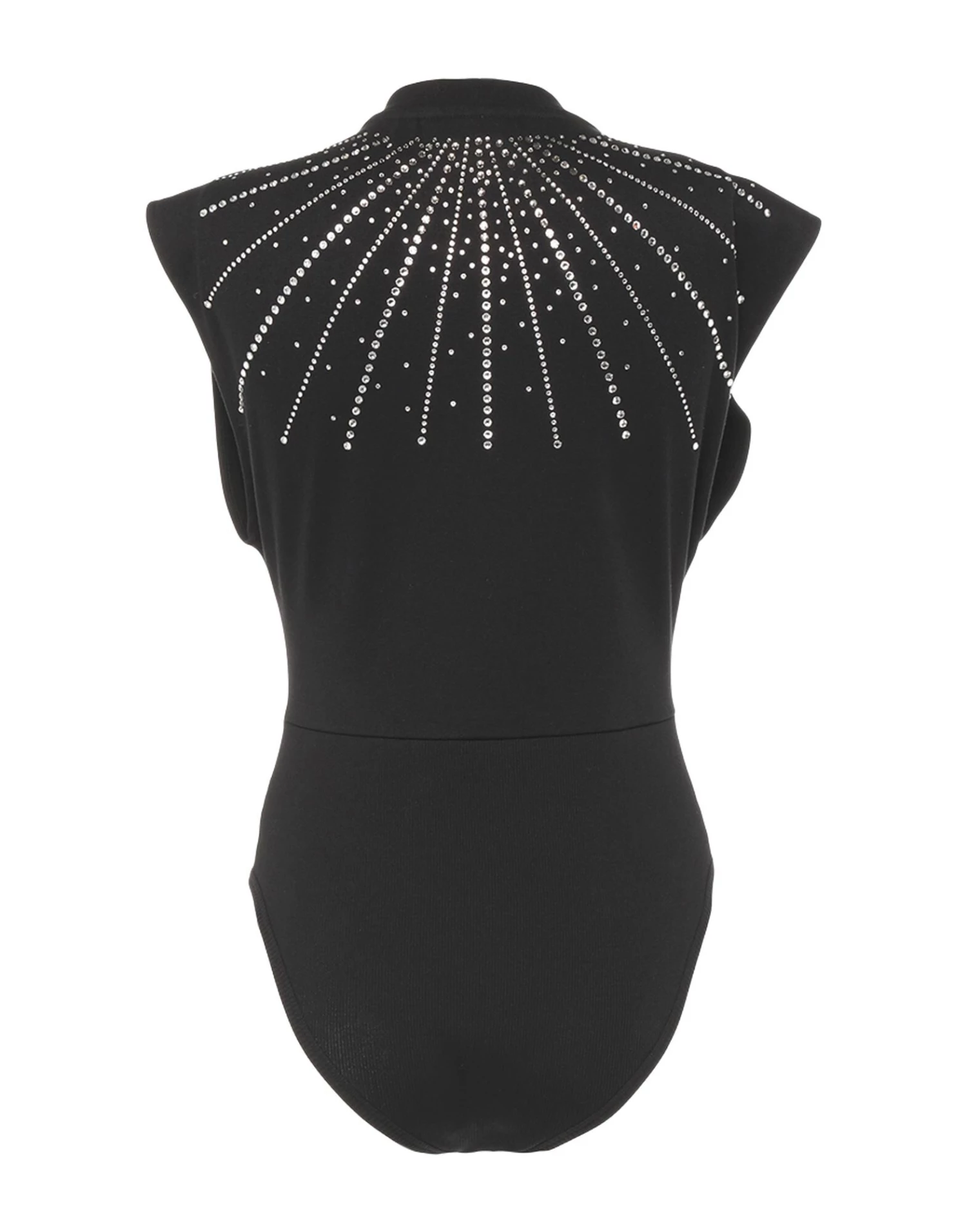 jersey, logo, rhinestones, solid color, round collar, sleeveless, snap buttons fastening, no pockets, crotch of body