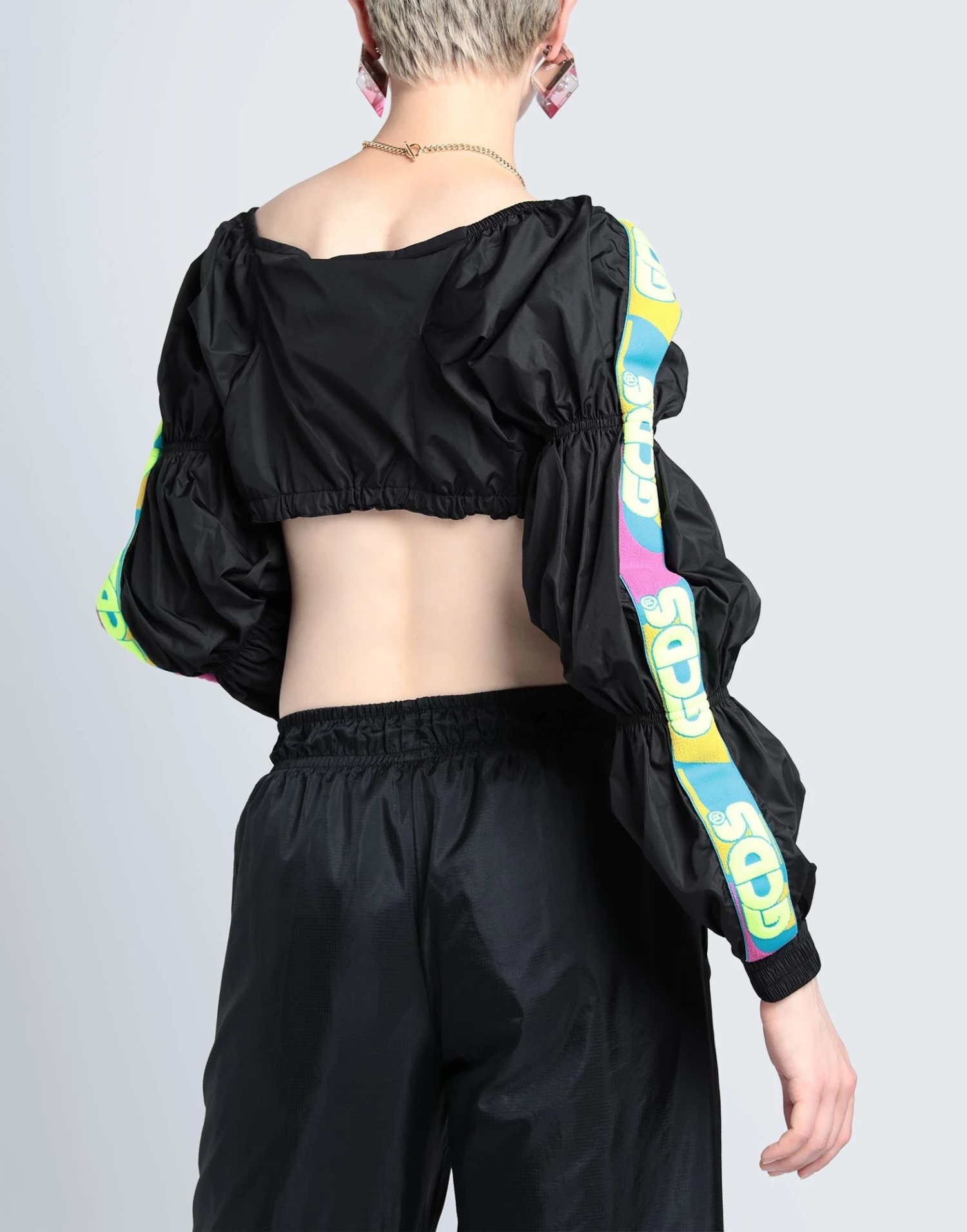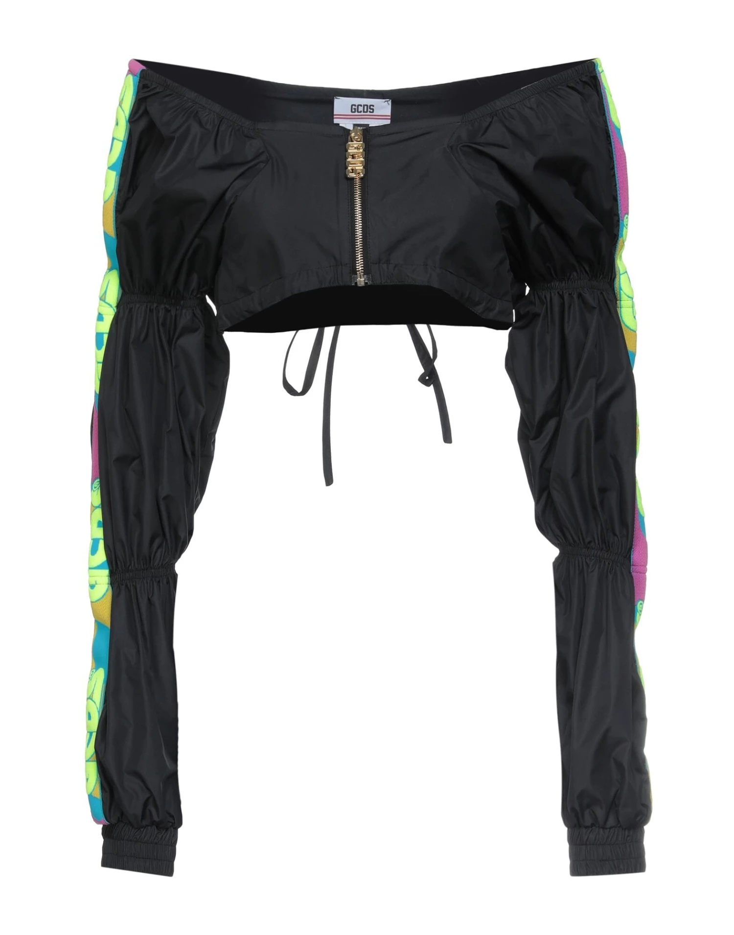 techno fabric, side seam stripes, brand logo, solid colour with appliquΓ©s, wide neckline, long sleeves, front closure, zipper closure, no pockets